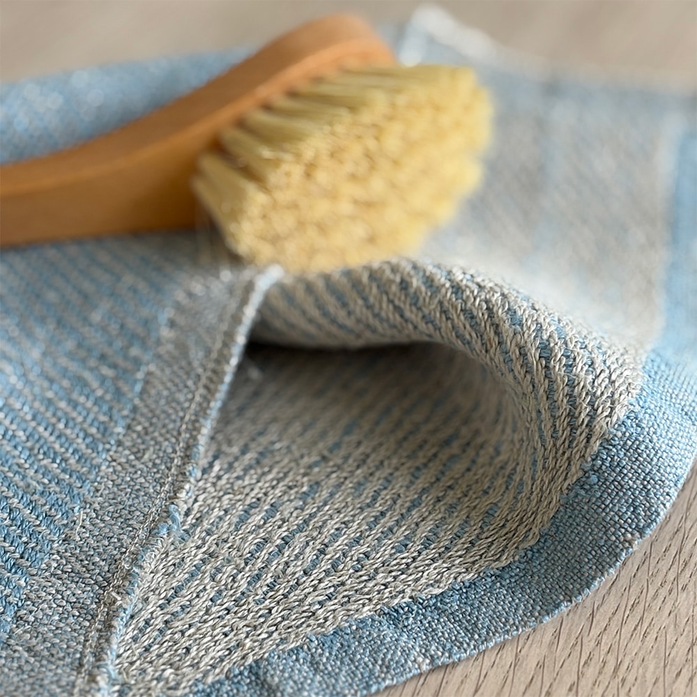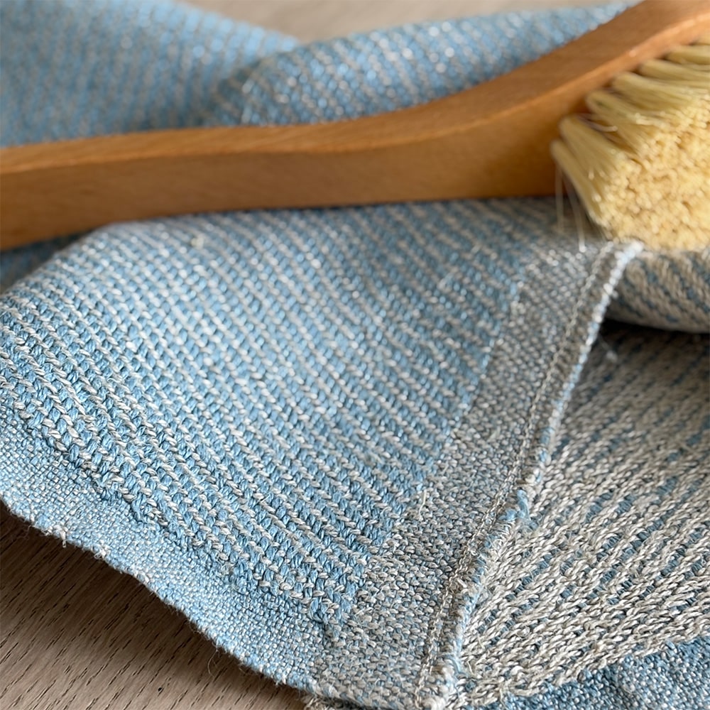 Håndvævet karklud i hør. Karkluden ligger fremme i vores lækre køkkener, hvor karkluden skal passe ind, være enkel og skabe ro for øjet. Den skal suge godt og tørre hurtigt.