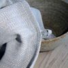Viskestykket er vævet i cottolin, som er en blanding af hør og bomuld, og giver en lækker kraftig kvalitet. Hør har fantastisk egenskaber, det suger væske effektivt, tørrer hurtigt og så er hør bakteriostatisk, hvilket betyder, at det er bakteriehæmmende. Blandingen af hør og bomuldsfibre giver et tekstil, der er slidstærkt og ikke krøller. Stroppen er håndvævet.