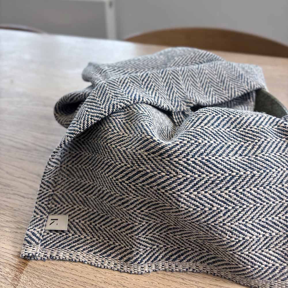 Viskestykke er vævet i cottolin, som er en blanding af hør og bomuld, og giver en lækker kraftig kvalitet. Hør har fantastisk egenskaber, det suger væske effektivt, tørrer hurtigt og så er hør bakteriostatisk, hvilket betyder, at det er bakteriehæmmende. Blandingen af hør og bomuldsfibre giver et tekstil, der er slidstærkt og ikke krøller. Stroppen er håndvævet.