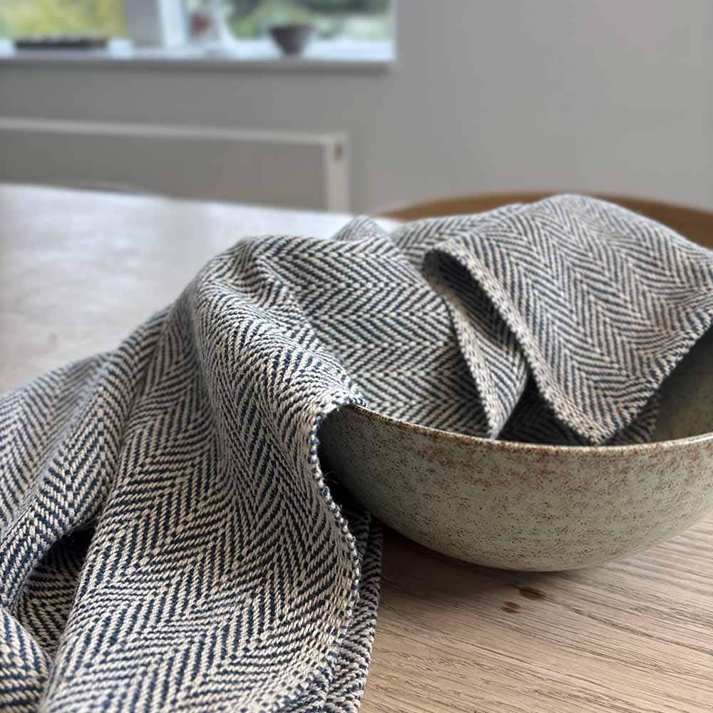 Håndvævet klassisk viskestykke i enkelt design. Vi har et viskestykke i hånden hver eneste dag. Det hænger fremme i vores pæne køkkener. Det skal suge godt og tørre hurtigt. Designet er vævet i en kippervariant med en panamakant, som giver viskestykkerne deres klassiske særkende, som er enkel og skaber ro for øjet.